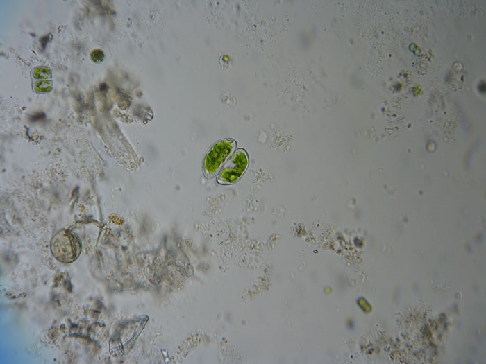 Das Objekt meiner Begierde war die folgende Zieralge (Staurodesmus?), die ich heute in einer älteren Probe fand. Dies ist das Originalfoto: