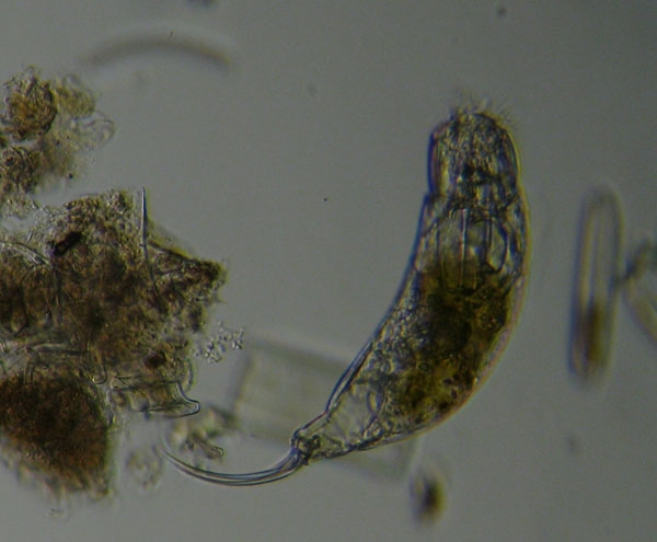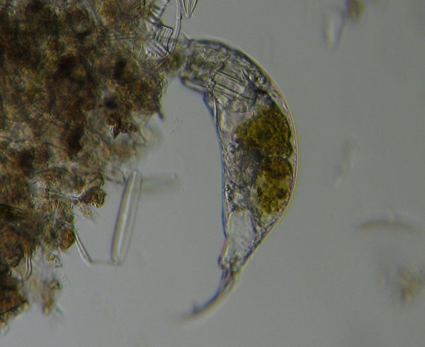 Zitatwürde ich Proben vom Detritus befreien, gäbe es darin ganz flott kein Leben mehr. Nach dem Sammeln schütte ich die Proben lediglich durch ein kleines Haushaltssieb, so dass die ganz groben Bestandteile herausgefiltert werden. Aber etwas Detritus muss schon sein. Zudem verhindert er eine zu starke Quetschung der Organismen, die ich ja nicht nur fotografieren, sondern auch beobachten möchte.