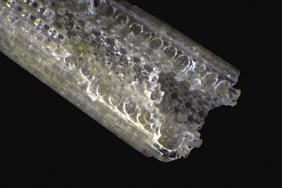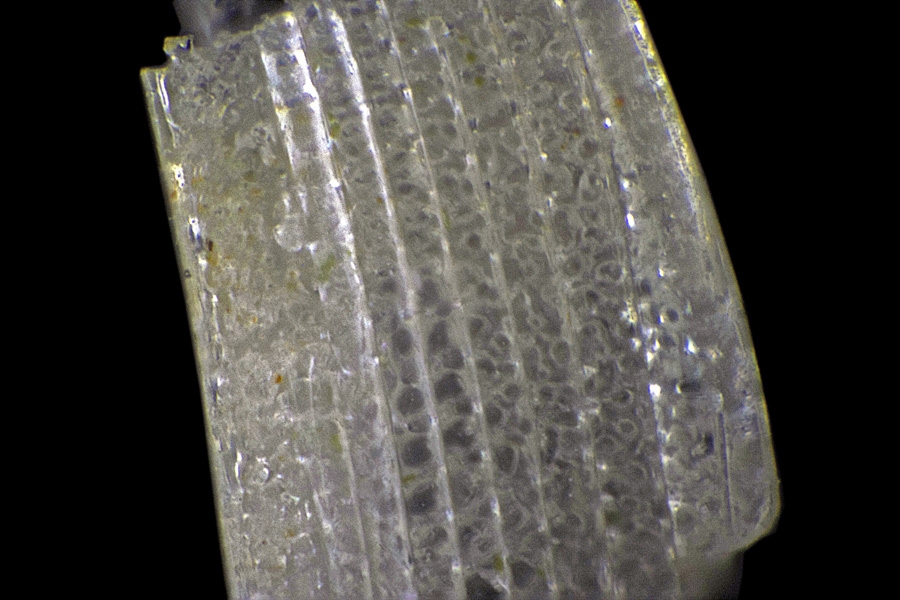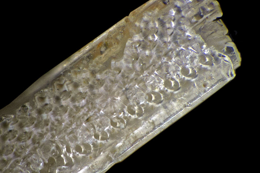 Man schaut hier zwischen zwei Längsrillen in den Binnenraum des Stachels hinein. Ein paar weitere Bilder vom Seeigelstachel zum Vergleich finden sich auf meiner Website