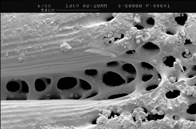 Ich denke, Thomas lag mit seinem ersten Gedanken durchaus richtig: Es ist ein Stück Seeigelstachel, wie man es im Strandsand oft findet. Man sieht außen die Längsrillen und im letzten Bild auch die spongiose Binnenstruktur, die vor allem an der Stachelbasis ausgeprägt ist. Hier mal ein REM-Bild von einer solchen Stelle:
