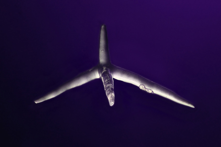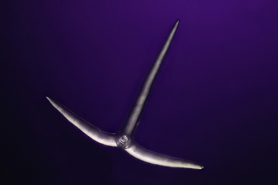 Meines überschaubaren Wissens nach, müssen Objekte, die zwischen gekreuzten Polfiltern liegen, doppelbrechende Eigenschaften haben, um eine "Bildwirklung" zu haben. Die gläsernen Nadeln sind nicht doppelbrechend, das ist mal sicher.