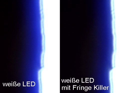 Und wie ist die wahre Wirkung? Am Beispiel mit einem alten Meopta Achromat, einer weißen LED als Quelle und schiefer Beleuchtung an einem Testobjekt erkennt man sehr gut die Reduzierung des blauen Farbsaumes. Total unterdrücken geht leider nicht  :-[