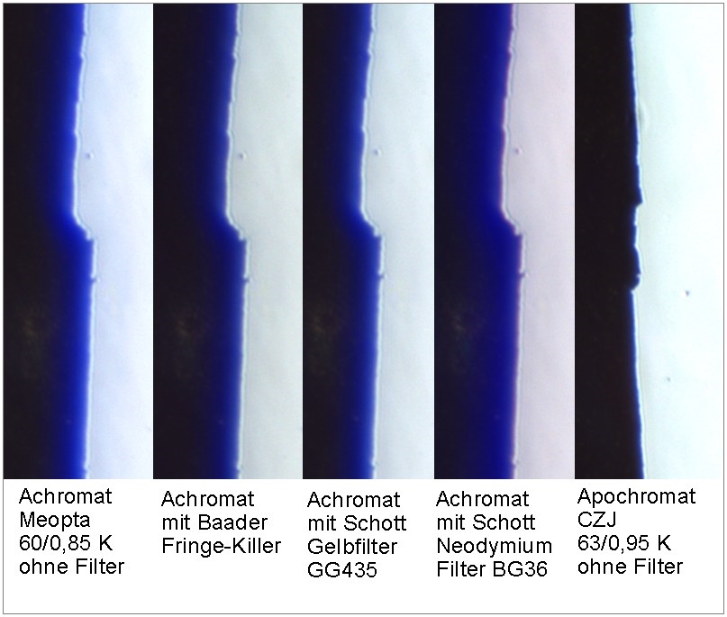 Aus dem Astronomiebereich kommt eine Filter mit Namen Fringe Killer. Der Zweck dieses Filters ist die Reduzierung der blauen Farbsäume bei der Nutzung von einfachen Achromaten. Wäre also dieses Filter nicht auch in der Mikroskopie von Vorteil?