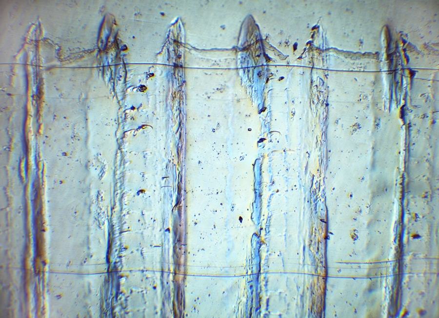 Das Cellophan wird mit einer Rippenwalze? zusammengepreßt, ich habe das ausgepackte Teil mal unters Lichtmikroskop gelegt und so kam bei polarisiertem Licht das Bild zustande.