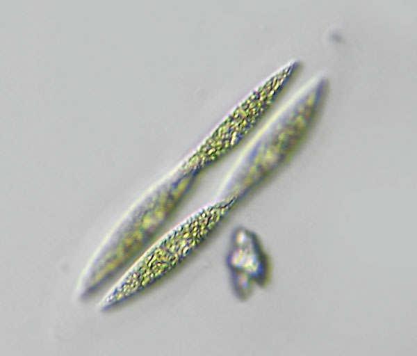 Du meinst sicher Quadrigula closterioides, oder? Dazu passt aber die Größe nicht. Die obigen Algen (es sind zwei in sich verdrehte Exemplare) sind mit ca. 65 µm viel zu lang.