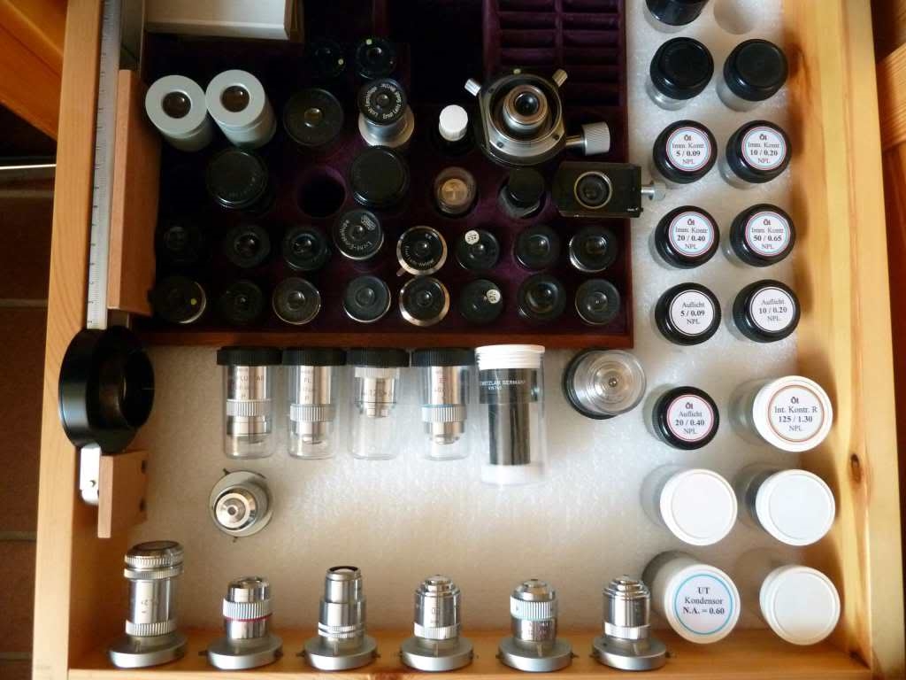 ...und eine Etage tiefer sieht's so aus (leicht bereinigt). Die regelmäßig genutzten Objektive für Auflicht hängen an der Wand der Schublade, die anderen sind staubdicht in Kunststoffdosen aufbewahrt.