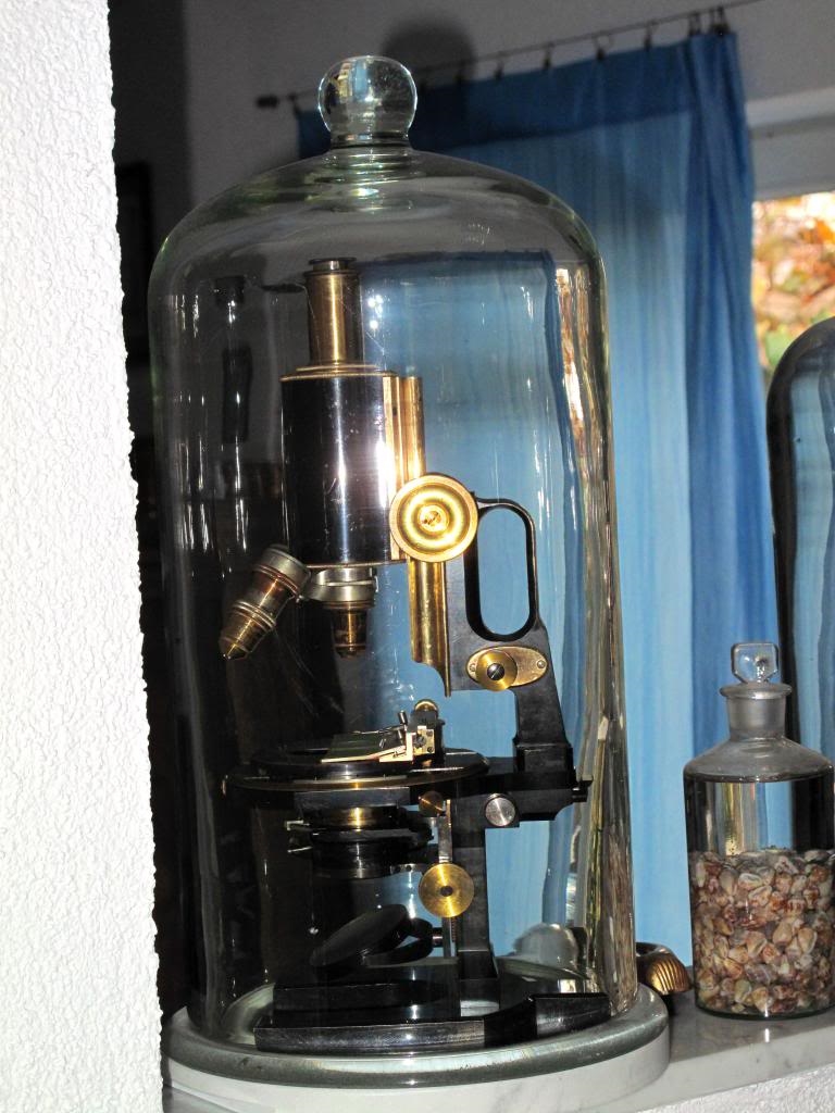 Mein "Bierseidel" von Zeiss steht unter einer Riesenglocke, die ich bei der Auflösung einer alten Glasbläserei gekauft habe, sie ist 45 cm hoch und war extra für Instrumente hergestellt worden, ebenso die kleinere unter der mein schönes Erbstück das Leitz Stativ III von 1886 steht.