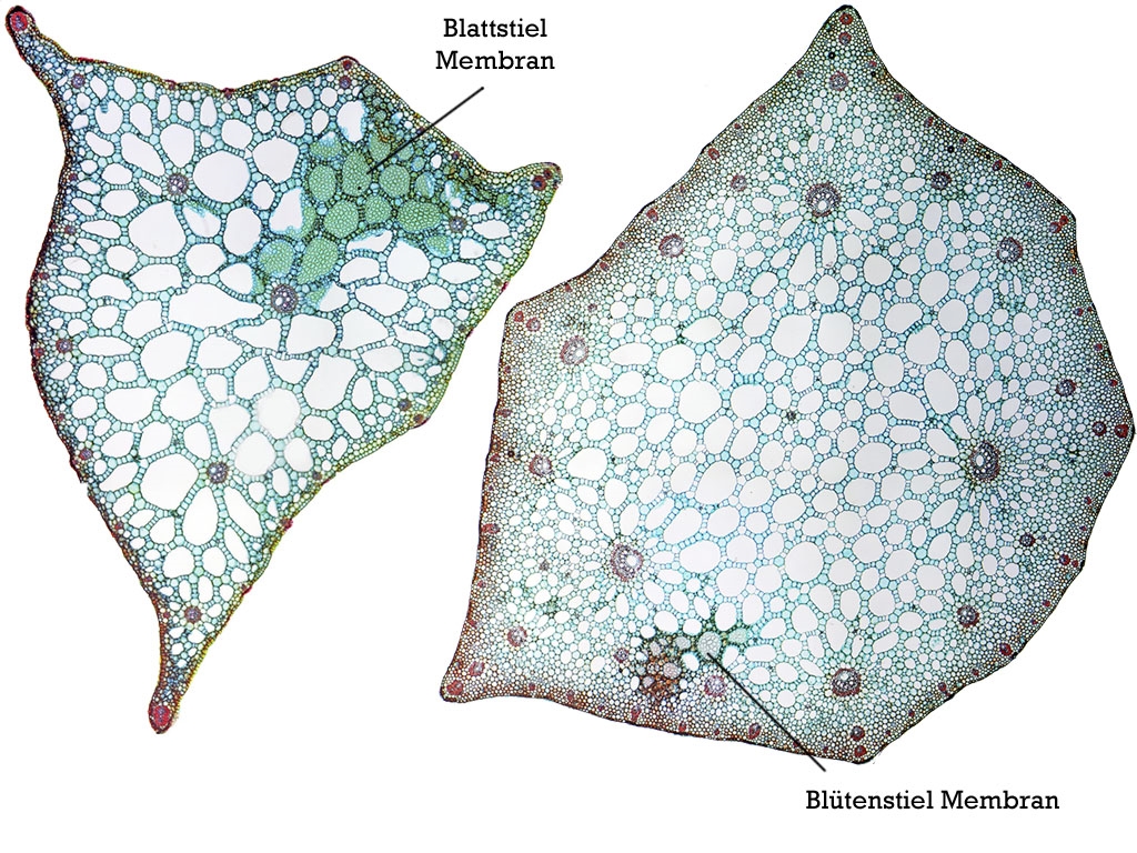 Die Membran-Zellen finden sich im Blatt- und im Blütenstiel. Im Blattstiel allerdings großflächiger und deutlich dichter angeordnet.