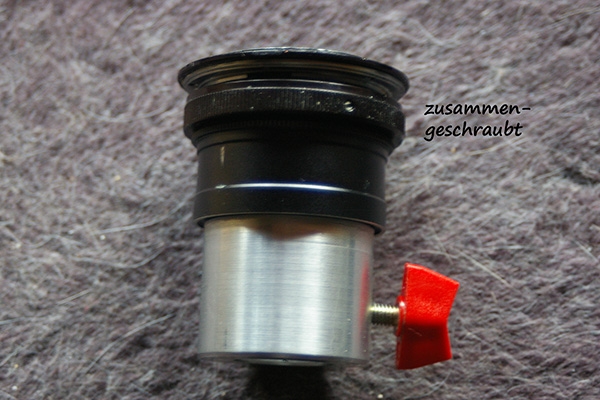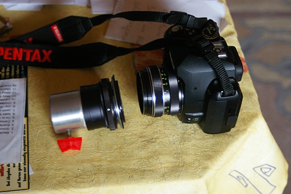 verklebt und dann mit dem normalen Fotoadapter (T2-Pentax-K) verbunden, Vater und Mutterbajonett - PASST!