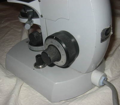 Ein Einstellknopf auf dem Fuß regelt die Helligkeit mit einer Thyristorsteuerung. Vierfacher Objektivrevolver.