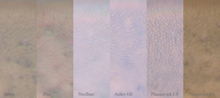 Die Trocken-Achromaten und das Planapo bei nA 0,6 loesen zwar schlechter auf, dafuer sind Bestandteile wie die Zellkerne leichter zu erkennen. Zugrunde liegt auch diesem Effekt die nA. Die bessere Erkennbarkeit ist ich echter Vorteil dieser Achromaten! Welches Objektiv man fuer das bessere haelt haengt also von der Verwendung ab. Um die Aufloesung des Planapo voll nutzen zu koennen bietet es sich an ein zusaetzliches  Konstrastverfahren zu benutzen, etwa schiefe Beleuchtung (weiter unten).