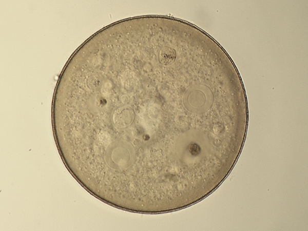 Ganze Arcella mit Zellinhalt; fokussiert habe ich auf einen der zwei Zellkerne im Inneren. Bildausschnitt entspricht etwa 50% der Originalaufnahme. Weitgehend unbearbeitet, aber verkleinert mit cubic sharper.