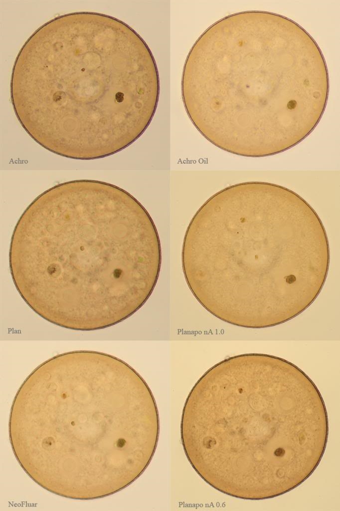 Neofluar, Achro Oel und Planapo zeigen feinere Details im Zellinhalt, zB Granula und Inhalt der Nahrungsvakuolen (besser zu sehen auf den Originalaufnahmen). Dafuer sind die einzelnen Zellbestandteile schlechter zu erkennen ("Kontrast" darf ich ja nicht sagen).