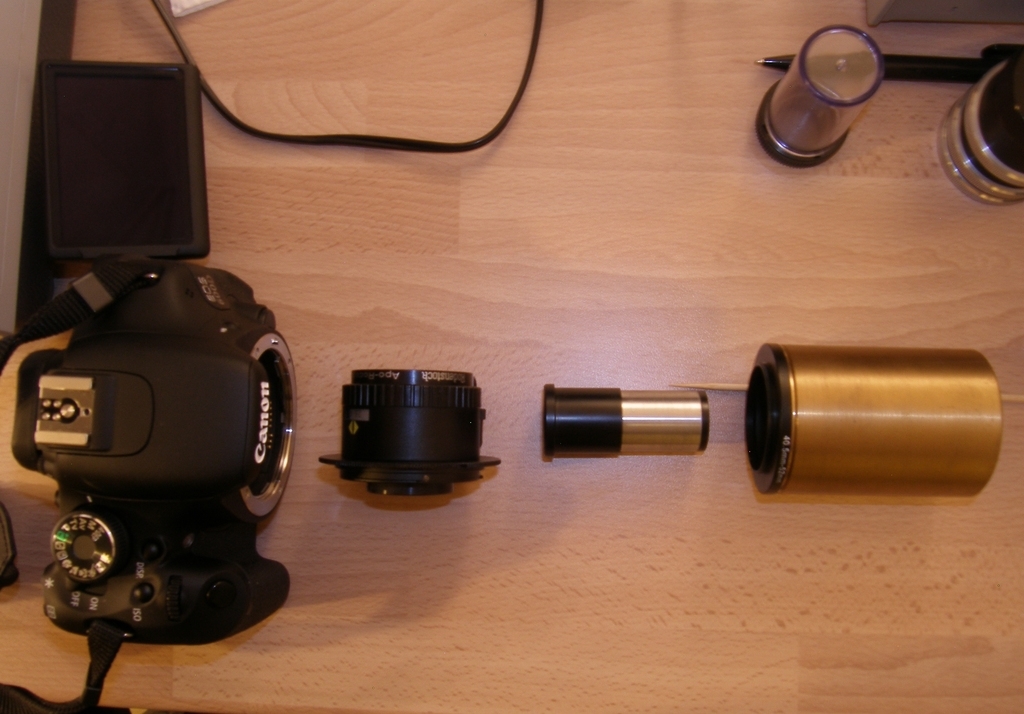 Meine APS-C-Kamera schließe ich mit optiklosem Adapter an, als Okular wird das KPL8x Brille verwendet. S-KPL hab ich auch, da ist aber das Bildfeld kleiner. Entscheidend ist die optische Adaption, so dass Austrittspupille des Okular möglichst nahe an die Eintrittspupille das Objektives kommt. Nach Test mit einem Zeiss Tessar (50mm) und einem Repro-Objektiv Rodernstock Apo-Rodagon 50mm hatte ich die besten Ergebnisse mit einem Helios mit 58mm Brennweite.