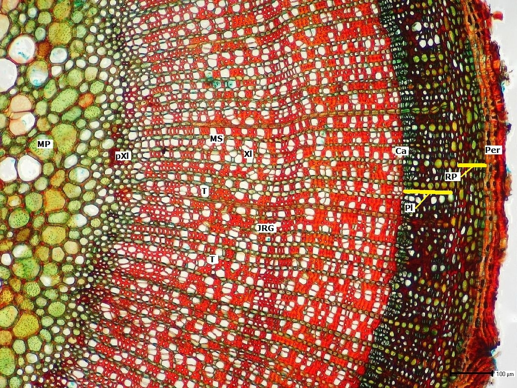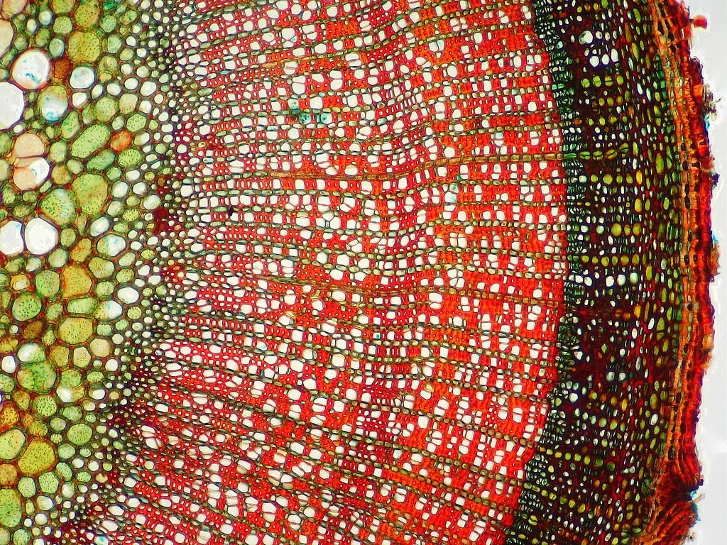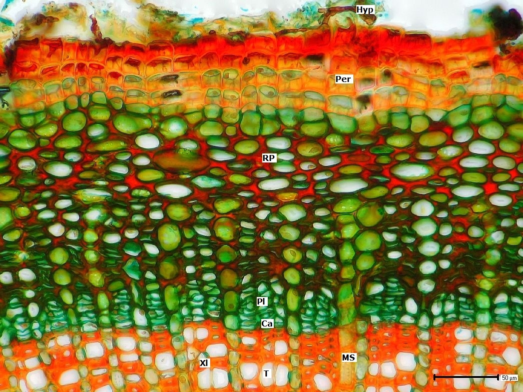 Der Querschnitt zeigt sich mit einem feinporigen Holzteil, in dem dicht an dicht die kleinen Tracheen liegen, das Phloem ist sehr schmal und wird von einem Rindenparenchym gefolgt, in dem sich der Zellverband an vielen Stellen bereits aufgelöst hat. Spannend ist auch das Abschlussgewebe, das aus mehreren Lagen sklerifizierter Zellen besteht. Die ungewöhnliche Struktur deutet darauf hin, dass die Pflanze unter starkem Stress steht.