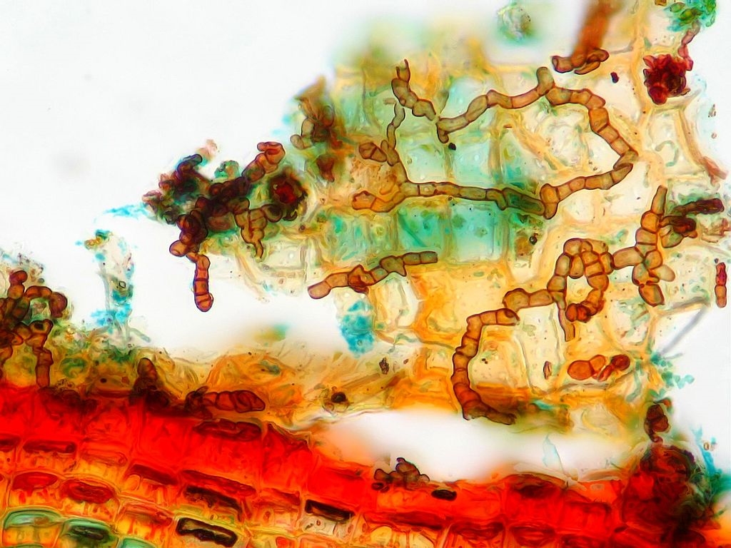 Während das Xylem (noch?) nicht verändert ist, haben sich die Zellverbände des Rindenparenchyms teilweise aufgelöst und auch das Phloem ist schon in Mitleidenschaft gezogen. Die Pflanze wehrt sich durch Sklerifizierung gegen eine Bedrohung, der sie hier nicht Herr zu werden scheint. Was aber führt zu diesen massiven Schäden bzw. Abwehrreaktionen? Dazu wenden wir uns dem nächsten Bild zu.