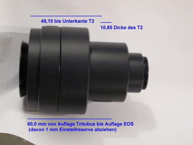 Du kannst dazu deinen im rechten Teil des Bildes gezeigten Adapter einfach anpassen. Im dicken Teil des Rohrbereichs absägen und plandrehen. Rohrduchmesser auf ca 5 mm so abdrehen, das das 5mm Teil gerade in das 42 mm Gewinde des gekauften T2 Adapters (z.B. Hama in Fotoladen ca. 30 Euro) für Canon passt. T2 Adapter am Gewinde mit 2 Komponenten Epoxidharzkleber (z.B. Uhu - Plus endfest 300) bestreichen und aufschieben. 20 min in Ofen bei 100 °C aushärten. Klebenaht mit schwarzem Eddingstift schwärzen und fertig ist der Adapter.