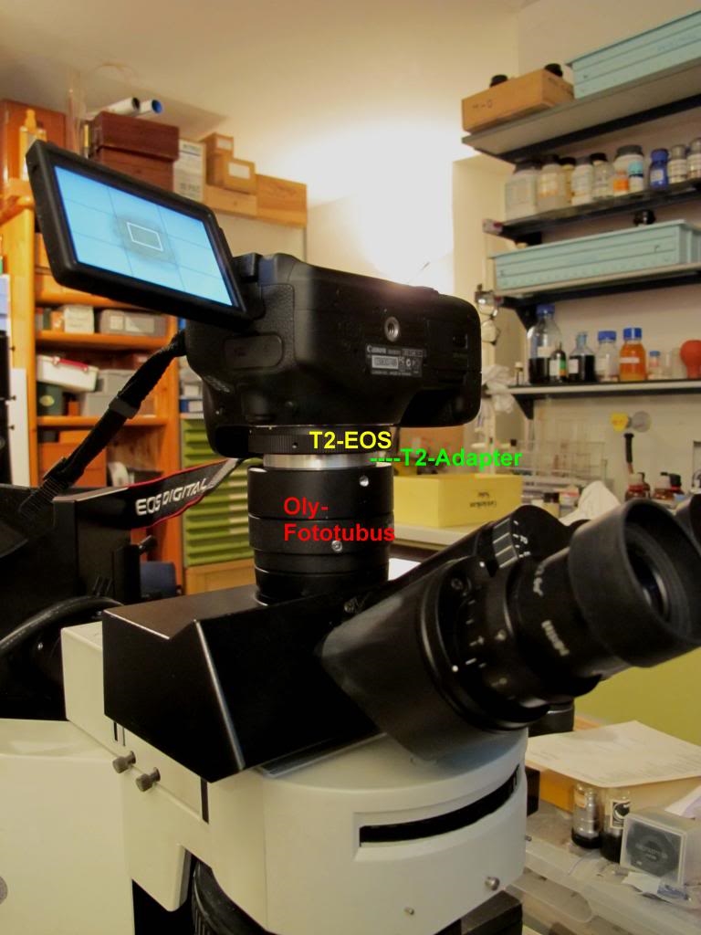 Eine schoene Adaptation. Mit einer Hoehe von 60 mm ist sie deutlich kompakter als Olympus' eigene Loesungen (zB Phototubus BX mit PE Photookular und Adapter L, zusammen fast 24 cm hoch).