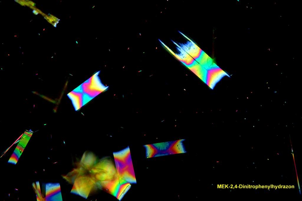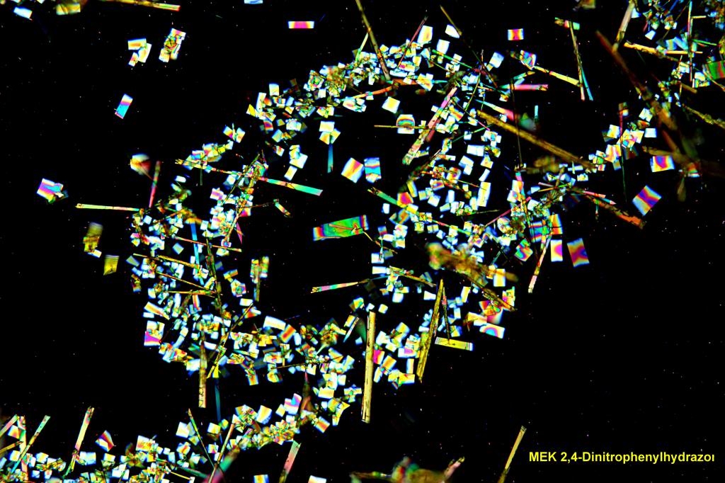Als letzte Absicherung kann man noch eine Umsetzung mit 2,4 Dinitrophenylhydrazin machen, das würde das entsprechende Hydrazon geben, das schwerlöslich ist und einen Schmelzpunkt 117° besitzt. Die Überprüfung mit dem Schmelzpunktmikroskop hat 116° ergeben, was dann eindeutig ist.