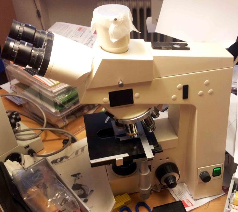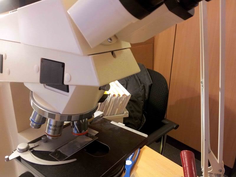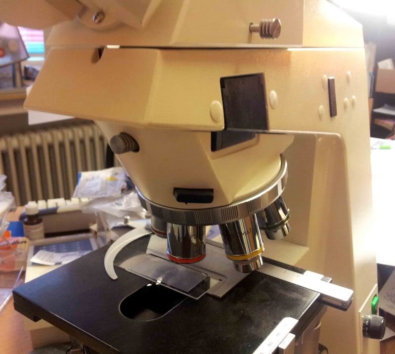 Der Trino-Tubus ragt seitlich über das Stativ heraus. Er ist also größer als das eigentliche Stativ, der stammt nämlich vom AxioPLAN. Solche "Mutanten" haben wir hier im münsteraner Institut auch, die wurden offenbar von Zeiss so geliefert. Der Axioskop-Tubus ist nämlich für Sehfeld 20 ausgelegt, mit dem Axioplan-Tubus realisiert man Sehfeld 25! Pathologen lieben sowas! Und es funktioniert super !