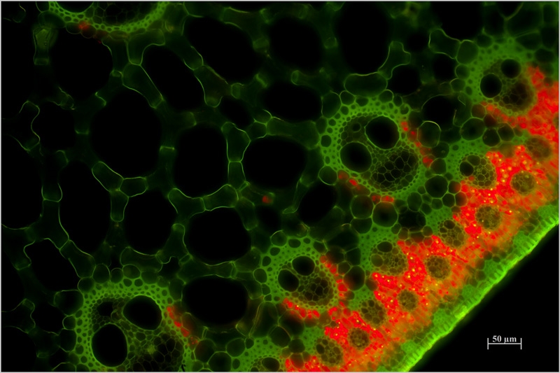 Sehr schön zu erkennen auch die Fluoreszenz des Cutins in der Epidermis.
