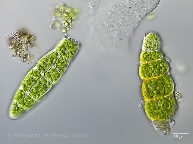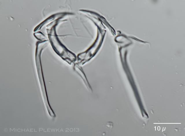 In letzterer Probe fand ich auch  in großer Menge (ca 50 pro Wassertropfen unter dem Deckglas) dieser Gebilde (??Entwicklungsstadien eines Mooses??), die in der anderen Probe völlig fehlen: