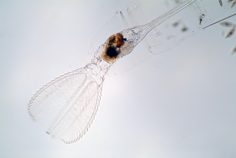 Die Fransenkrone findet man ofenbar auch sehr regelmäßig auf der Unterseite von Seerosenblättern in (Garten-)Teichen. Speziell eine Art, die durch ihre braune Wohnröhre schon unter der Lupe zu erkennen ist. Faszinierend ist die burgunder-rote Färbung der Fangreuse im Dunkelfeld. Leider hat es mit dem Fotografieren damals nicht geklappt!