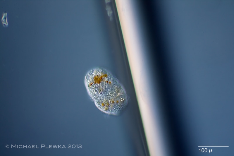 Timo ist  auch schon nahe dran (Didinium gehört in dieselbe Gruppe). Es handelt sich um den Ciliaten Cyclotrichium viride, gefunden im Plankton des Kemnader Sees/ Bochum. Das kann man selbstverständlich nicht aus dem Bild ableiten.  Das erste Bild ist in dieser eigentlich Form nicht intendiert gewesen, es ist genauso wie Holger es vermutet hat. Aber gerade weil der Blitz versagt hat, zeigt es  sehr schön, dass dieser Ciliat auf einer Stelle um die eigene Achse  rotiert (Belichtungszeit 1/2 sec), um dann mit hoher Geschwindigkeit aus dem Blickfeld zu verschwinden. Hier das selbe Viech, einige Sekunden später, diesmal geblitzt: