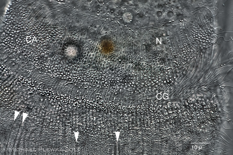 In einer um einige µ versetzten Fokusebene zeigen sich bei einem anderen Viech die Basalkörper des Ciliargürtels (CG) sowie weiter zum vorderen Zellpol hin die Nematodesmen (N) (= Stäbe des Mundapparats):