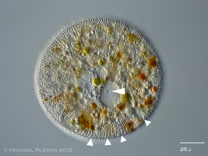 Ähnlich dem Feld der Röhrenblüten der Margerite  befindet sich bei C. viride am vorderen Zell(Nord)pol  das Mundfeld (Oral Dome, OD), das keine Cilien besitzt. Deshalb sind dort sehr schön die Alveolarplatten (Cortical alveoli = CA) zu erkennen. Lt. FOISSNER ernähren sich die Viecher räuberisch von anderen planktischen Ciliaten wie Limnostrombidium viride. Ein Teil der Färbung könnte deshalb vom verdauten Zellinhalt  diese Ciliaten (Algenfresser mit Zoochlorellen bzw. Kleptoplasten) stammen. Daneben gibt es wohl auch Cyclotrichium- Formen, die selbst Zoochlorellen haben. Dies als mögliche Interpretation der verschiedenen Farben des Zellinhalts.: