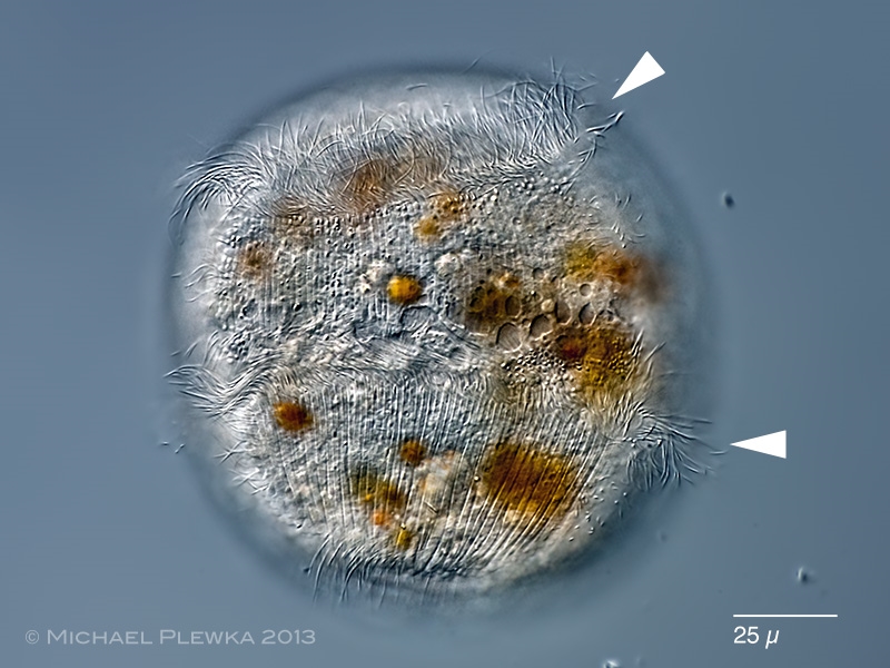 Cylotrichium viride hat einen Cirrenkranz, der sich "nördlich" des Zelläquators befindet; quasi in der Lage der (Zungen-) Blütenblätter der Margerite.  Der Blitz friert den metachronen Cilienschlag ein: