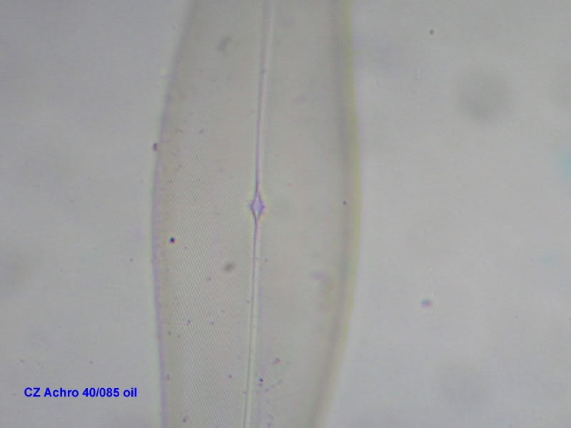 Ich habe heute Morgen dieses Objektiv getestet an einer Pleurosigma um was "genormtes" zu verwenden. Mit einem Planachromaten 40/0.65 ahnt man einen Hauch einer Auflösung der Gitterstruktur. Mit dem Achromaten 40/0,85 öl ist sie natürlich tadellos aufgelöst und mit einem Planapo 40/1,0 PH 3 ist es noch besser, aber nicht 3x besser nach meiner Meinung. Wobei mit Phase ist es natürlich sehr gut! Leider hat sich beim Test nebenbei herausgestellt, dass mein Planapo 40/1,0 total delaminiert ist. Habe ich erst gemerkt, als die Auflösung so dürftig war.