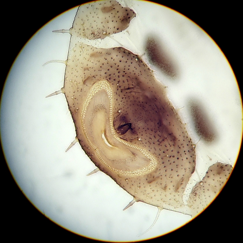 Bild 35: Abdomen mit Afterring und Borsten (seta) bei 400x. Auch die Borsten werden zur Artbestimmung herangezogen, hier beringte zweiteilige Borsten (ringed sectaseta). Siehe Morphologie der Psyllidis-Nymphen unter "some nymphal setal types" und "nymphal anal rings and pore regions".