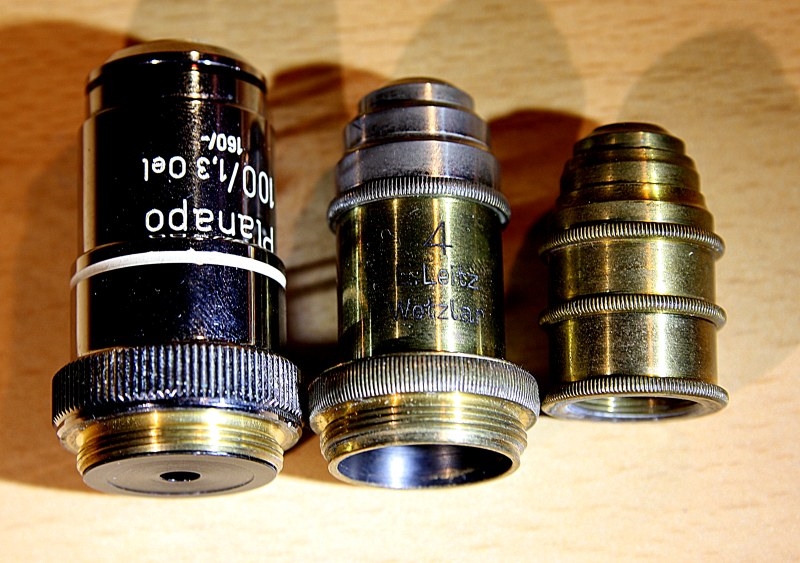 Man könnte den Zögerlichen noch eine Zeitspanne zum Überlegen einräumen, aber nach 1875 dürften kaum noch Objektive ohne RMS-Gewinde gefertigt worden sein. Später (nach 1900 glaube ich) wurden dann für Auflichtobjektive in der Metallurgie und Mineralogie metrische Gewinde eingeführt und arithmetrische Vergrößerungsstufen bei den Objektiven mit Unendlich-Abbildung.