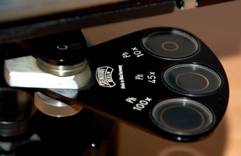 Dann noch ein weiteres "Steindorff": Man beachte an dem schwarzen Mikroskop die extrem simple, aber dennoch absolut funktionelle Einrichtung für das Einschwenken und die Zentrierung der Phasenkontrastringblenden.