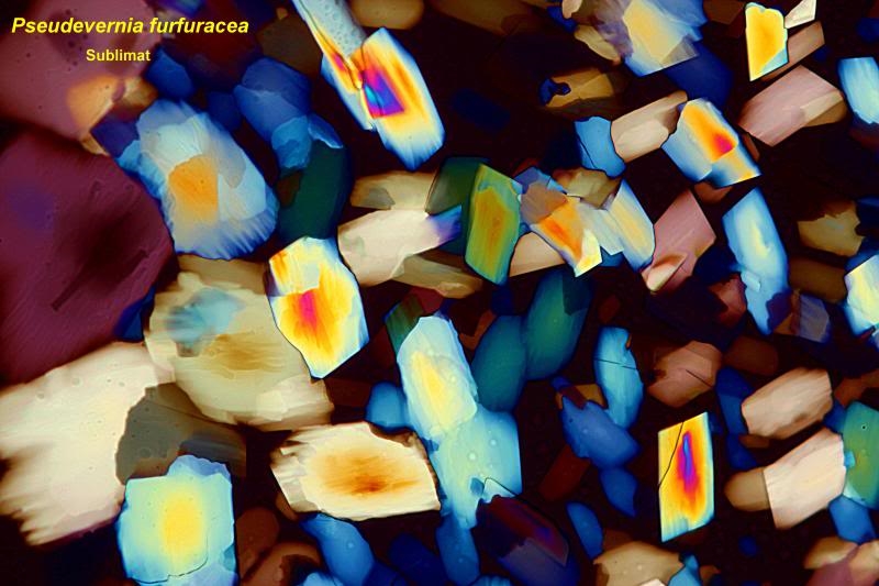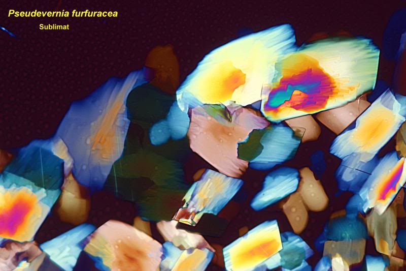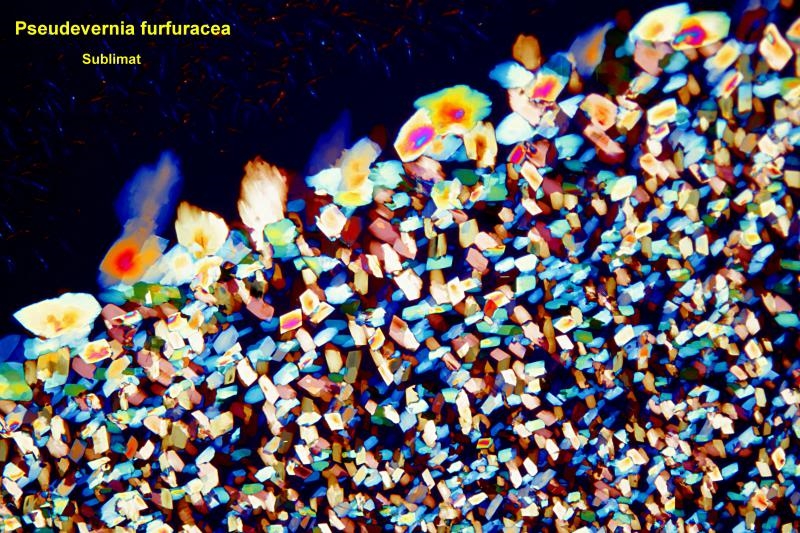 Ich habe nachgelesen, dass diese Flechte mehrere Flechtensäuren enthält: Physotsäure, Oxiphysotsäure, Olivetorsäure, Alectotronicsäure. Bei der Sublimation sollten sich die einzelnen Substanzen eher in individuellen Reinkristallen abscheiden und durch Temperaturführung auch noch verschiedene Fraktionen erhalten lassen.