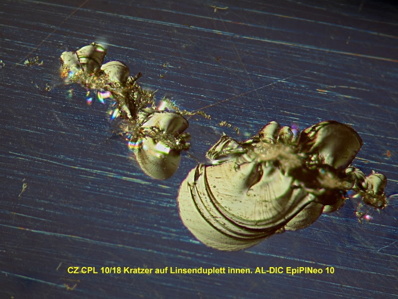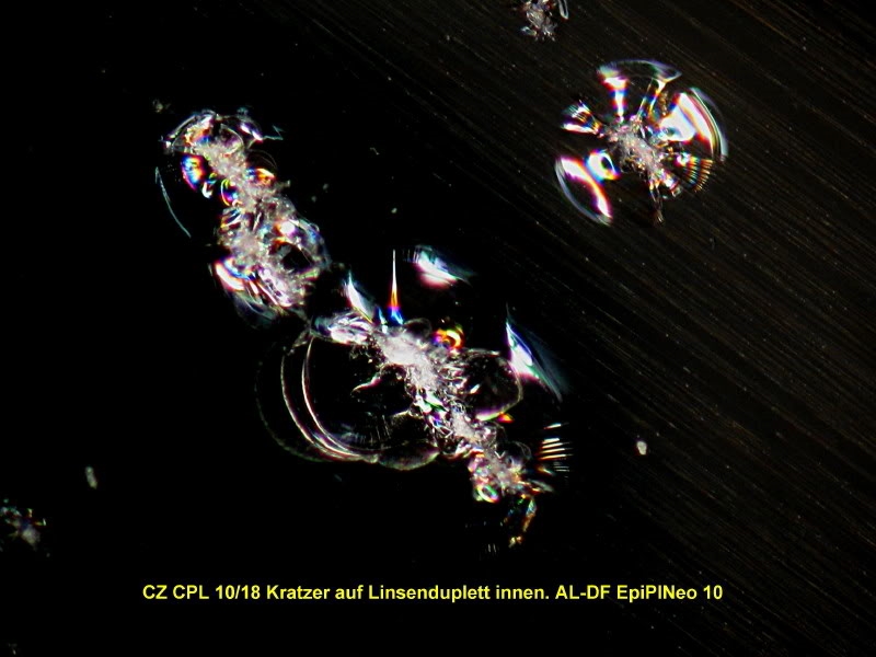 Auf der Unterseite des oberen Linsendupletts sind jeweils in der Mitte mehrere dicke Kratzer. Sowohl im AL-DF als auch im DIC sind die muscheligen Ausbrüche schön zu sehen.