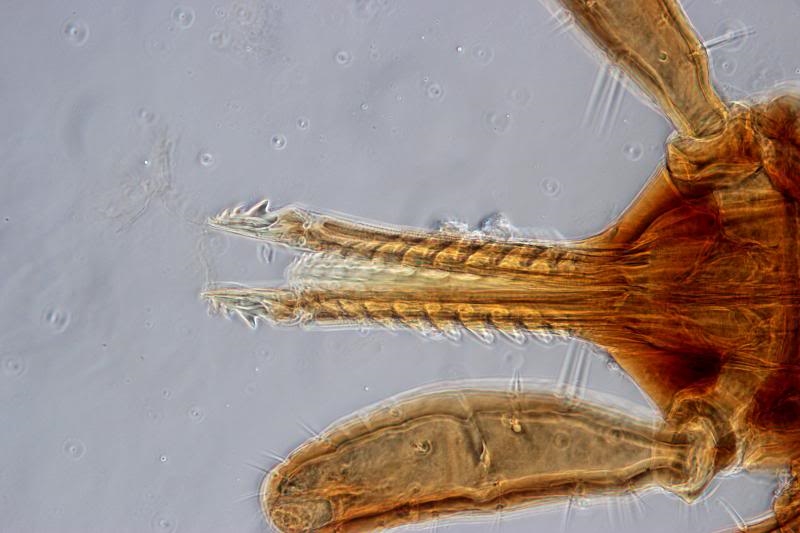 Ich hab mir letzte Woche beim Wandern im tiefen Schwarzwald eine aufgelesen, die sich unvorsichtig in mein Gesicht gesetzt hat, so dass ich sie beim Absingen der Rasierspiegelarie sofort entdeckt habe. Sie war noch sehr klein, knapp über ein mm. Hab sie gepflückt, in Isopropanol getränkt und dann in Euparal geplättet. So wie es aussieht ist der Stechapparat komplett.
