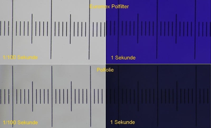 Rechts wurde die Belichtungszeit auf 1 Sekunde erhöht, der 2te Polfilter auf die Leuchtfeldblende gelegt und danach bis zur maximalen Abdunklung verdreht, an der LED-Helligkeit wurde nichts verändert.