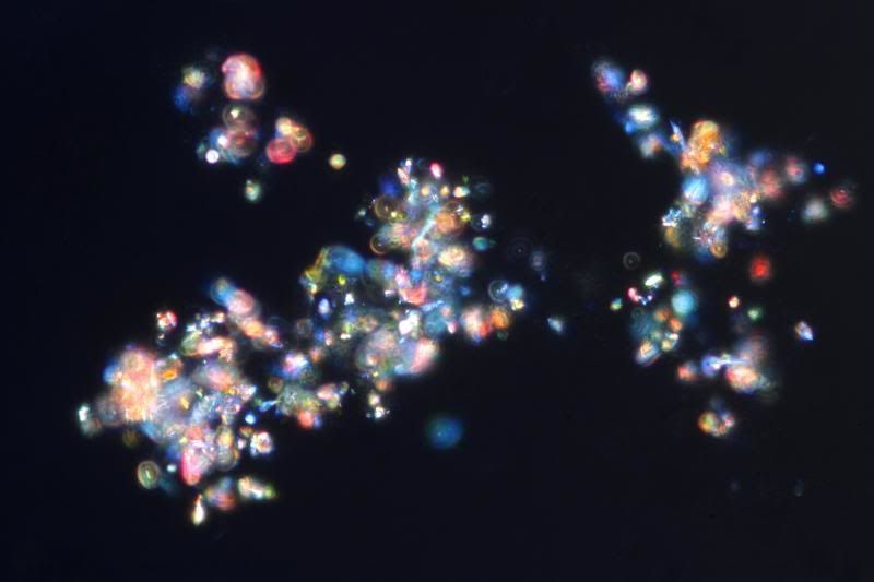 Am besten mit einer Hellfeldaufnahme. Wohlgemerkt: immer mit dem 40er Objektiv. Die doppelbrechenden winzigen Kristalle sind nicht wasserlöslich!