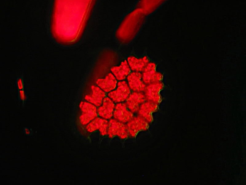 da täte ich mal nicht denaturiertes Chlorophyll in einem frischen Schnitt oder einem Moosblatt in der Fluoreszenz betrachten, wenn das nicht so rot aussieht: