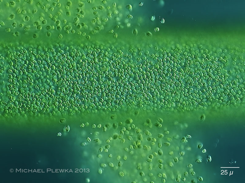 Es sind sind Tausende geißelbeweglicher  kleiner Zellen, sog. Isogameten, durch welche Hydrodictyon sich sexuell fortpflanzt. Ganz oben im Bild ist eine der zwei Geißeln an einer Zelle erkennbar. Die ursprünglichen Hydrodictyon-Zellen sind -im wahrsten Sinn des Wortes- bis zum Platzen voll mit diesen Isogameten: