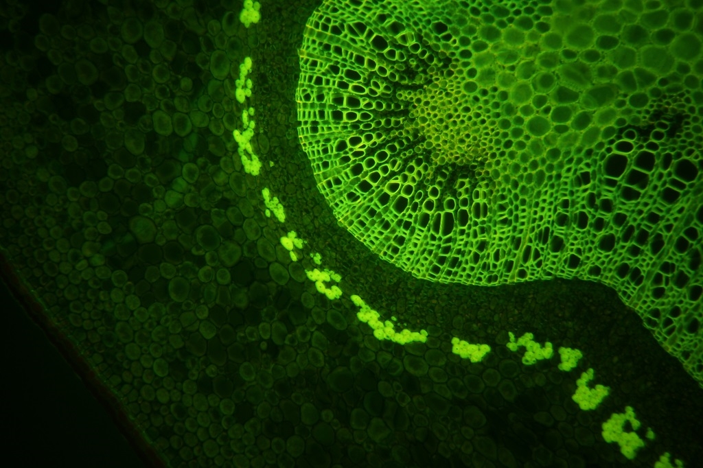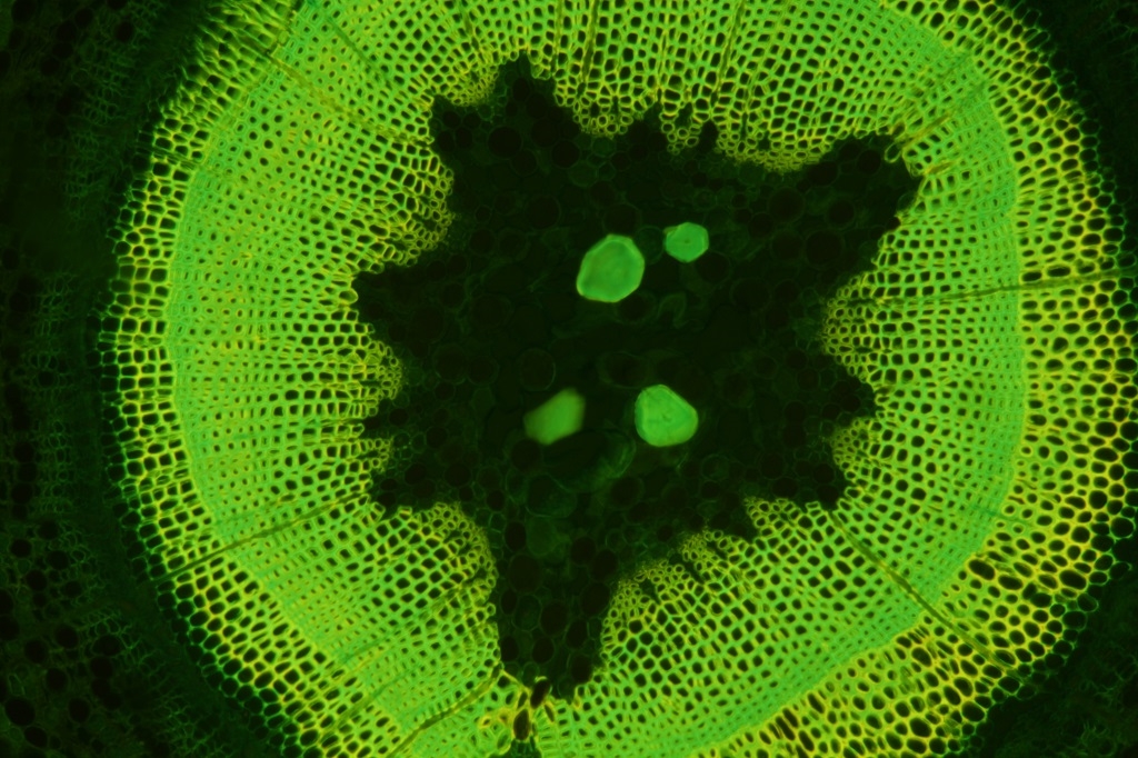 Fluoreszenzaufnahme durch den Spross der Eibe,30µm, W3A, Blauanregung
