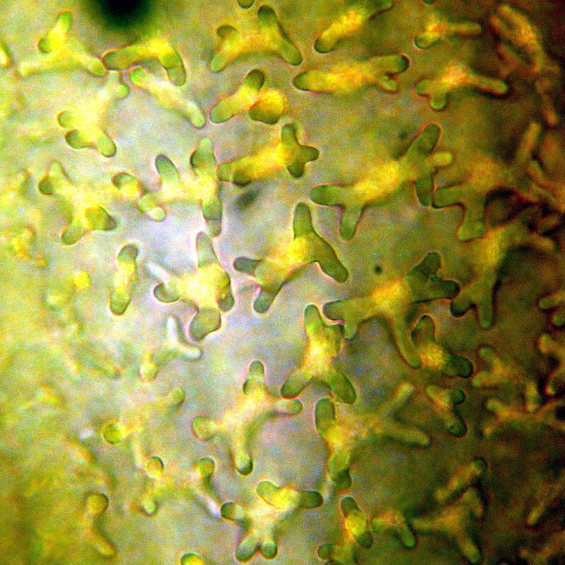 hier eine Aufnahme der Blattoberfläche von Tortula papillosissima. Man sieht die Papillen in der Aufsicht. Es gibt verschiedene Formen, aber die meisten sehen aus wie ein binärer Baum 2. Ordnung: ein Stiel mit einer Verzweigung, die Zweige verzweigen wieder 2-fach. Das ganze hat also 4 'Enden'. Es gibt allerdings auch 3- und 5-Ender.