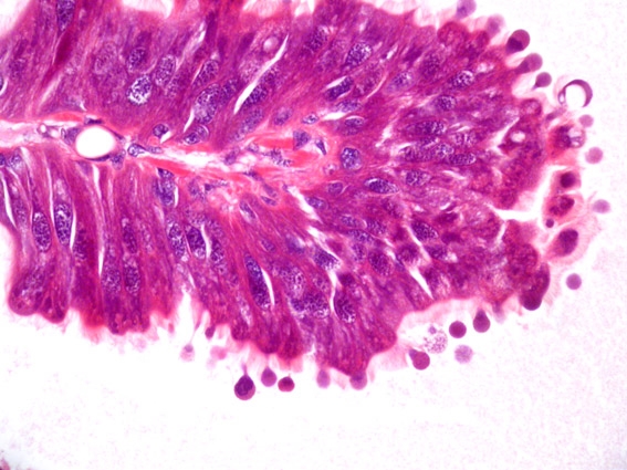 Oder die gesamte Zelle samt Zellkern löst sich auf, womit auch die gebildeten Sekrete ins Darmlumen gelangen. Vom ersten Fall habe ich irgendwo ein schönes Präparat, dass ich heraussuchen muss.