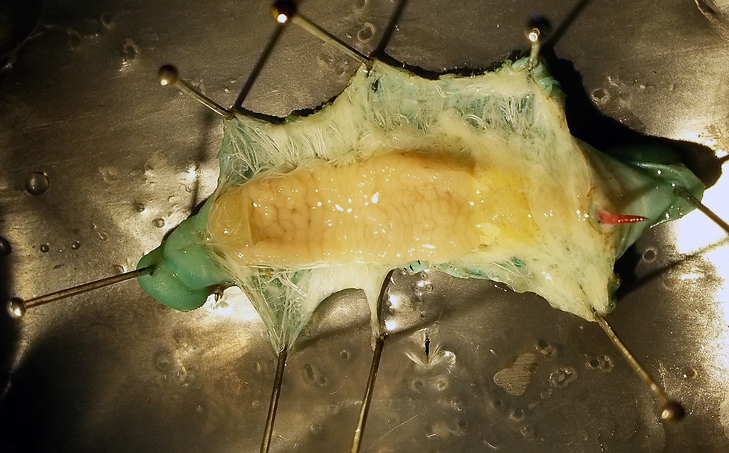 Im zweiten Bild sieht man ein Tier das frisch im letzten Larvenstadium ist, ebenfalls aufpräpariert. Deutlich sichtbar das hier noch kaum Fettkörper vorhanden ist. Das Innere ist etwas durcheinander da bereits der Darm längs geöffnet wurde um Gewebe zu entnehmen. Deutlich sieht man die von Jürgen angesprochenen "Wülste". Im Kopfbereich sind deutlich größere "Wülste" vorhanden weiter hinten. Der Darminhalt wurde übrigens entfernt, dies klappt manchmal recht einfach da die peritrophische Membran den Inhalt wie ein Säckchen umgibt, mit etwas Glück kann man diesen als ganzes entfernen.