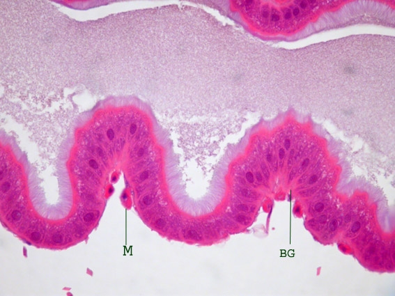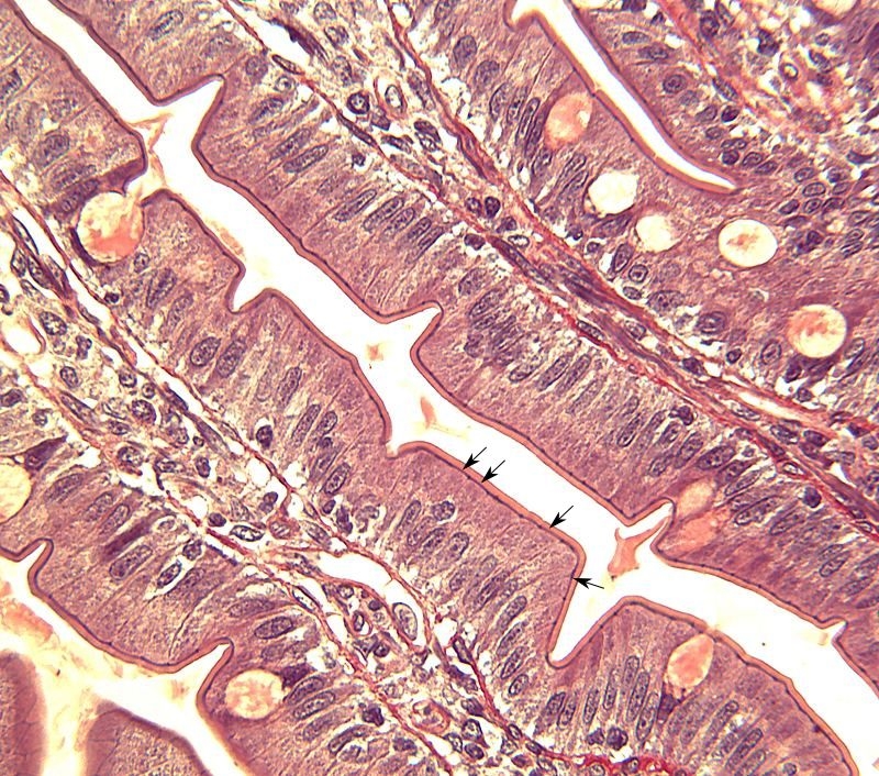 Zu dein Fragezeichen mochte ich sagen: 'L.C. Junqueira und J. Carneiro' schreibt da: "Glycocalix (fuzzy coat) von 0,5µm zwischen das Apikale Teil der Zelle und der Mikrovilli wo sich Sacharidasen, Peptidasen und andere Enzyme wie ein Filter befinden." (Beitrag aus 2010)