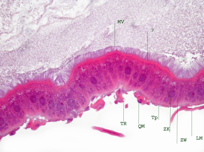 Zu der mit ? versehenen Stelle werden wir vielleicht in einem Kunststoffschnitt Näheres sehen. Es müsste sich ja um eine Epithel handeln, das zum Transport von Stoffen geeignet ist, vermutlich auch einen hohen Mitochondrienbesatz aufweist. Vielleicht müsste ich auch eine andere Färbung versuchen, als die der Übersichtsfärbung von Hämatoxylin und Azophloxin.