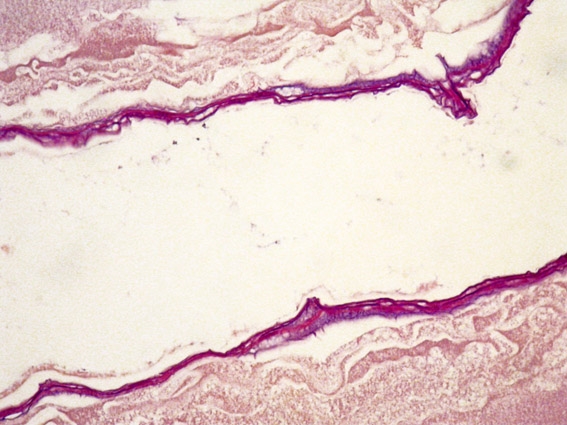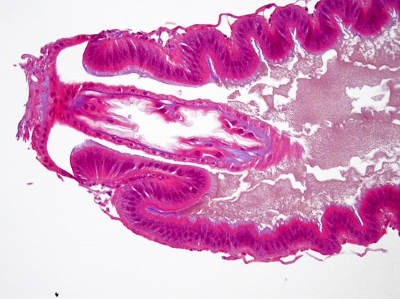 Hier ein schon wesentlich späterer Darmabschnitt. Das Gebilde ist immer noch vorhanden. Jedoch erscheint das Zellgewebe bereits denaturiert. Das Bindegewebe ist zwar noch scharf blau gezeichnet zu erkennen. Beidseits des Bindegewebes ist jedoch keine deutliche Zellstruktur mehr zu vorhanden. Zellkerne sind nicht mehr zu sehen.