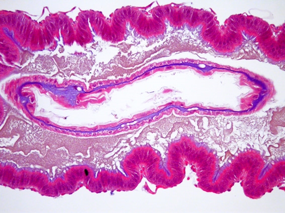 Ein Schnitt tiefer zeigt sich, dass sich dieses Gebilde, offenbar röhrenförmig, in den Darm hinein fortsetzt. Scharf blau gefärbt erscheint mittig ein Bindegewebe, dass von Trachen (den kreisrunden Löchern) durchzogen ist. Beiseits des Bindegewebes befinden Zellen mit Zellkernen. Für mich stellt sich der Sachverhalt auf Grund einer nicht! vollständigen Schnittserie so dar, als wäre eine weitere Röhre in das Darmlumen hineinverlegt, die sich sehr weit in den Darm fortsetzt: